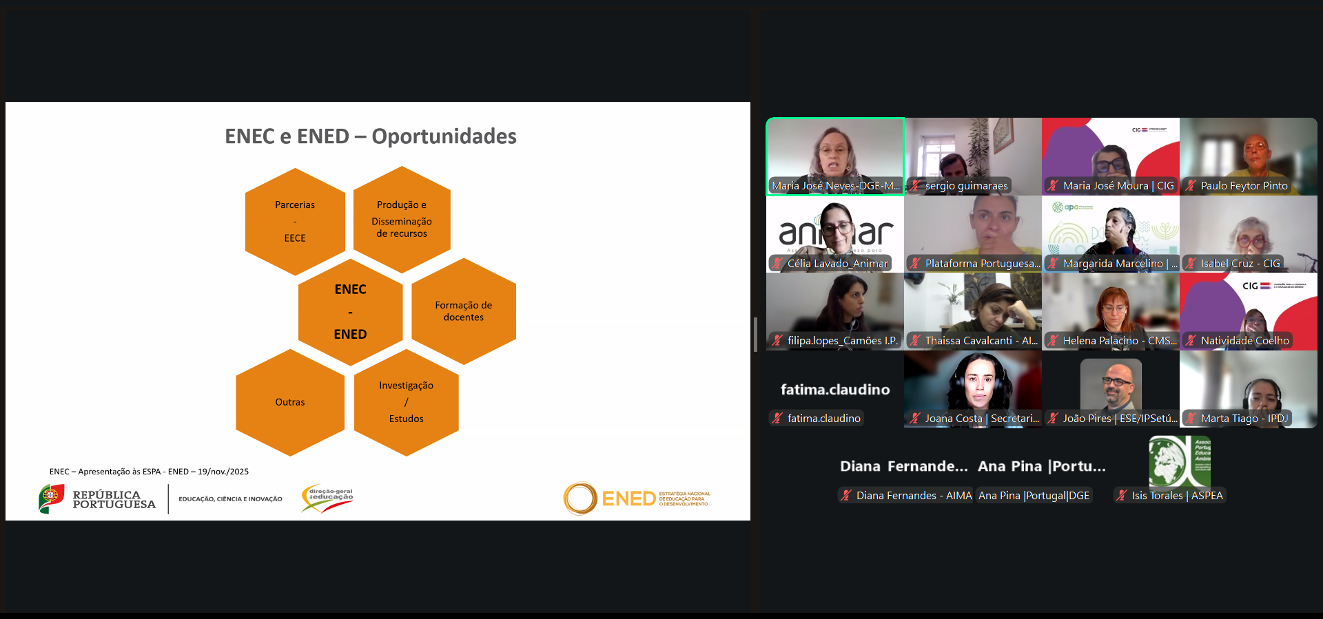 Decorreu hoje, 19 de novembro DE 2025, entre as 10h00 e as 11h30, o segundo webinar dirigido às Entidades Subscritoras do Plano de Ação (ESPA) da ENED 2025-2030, reunindo 19 participantes.